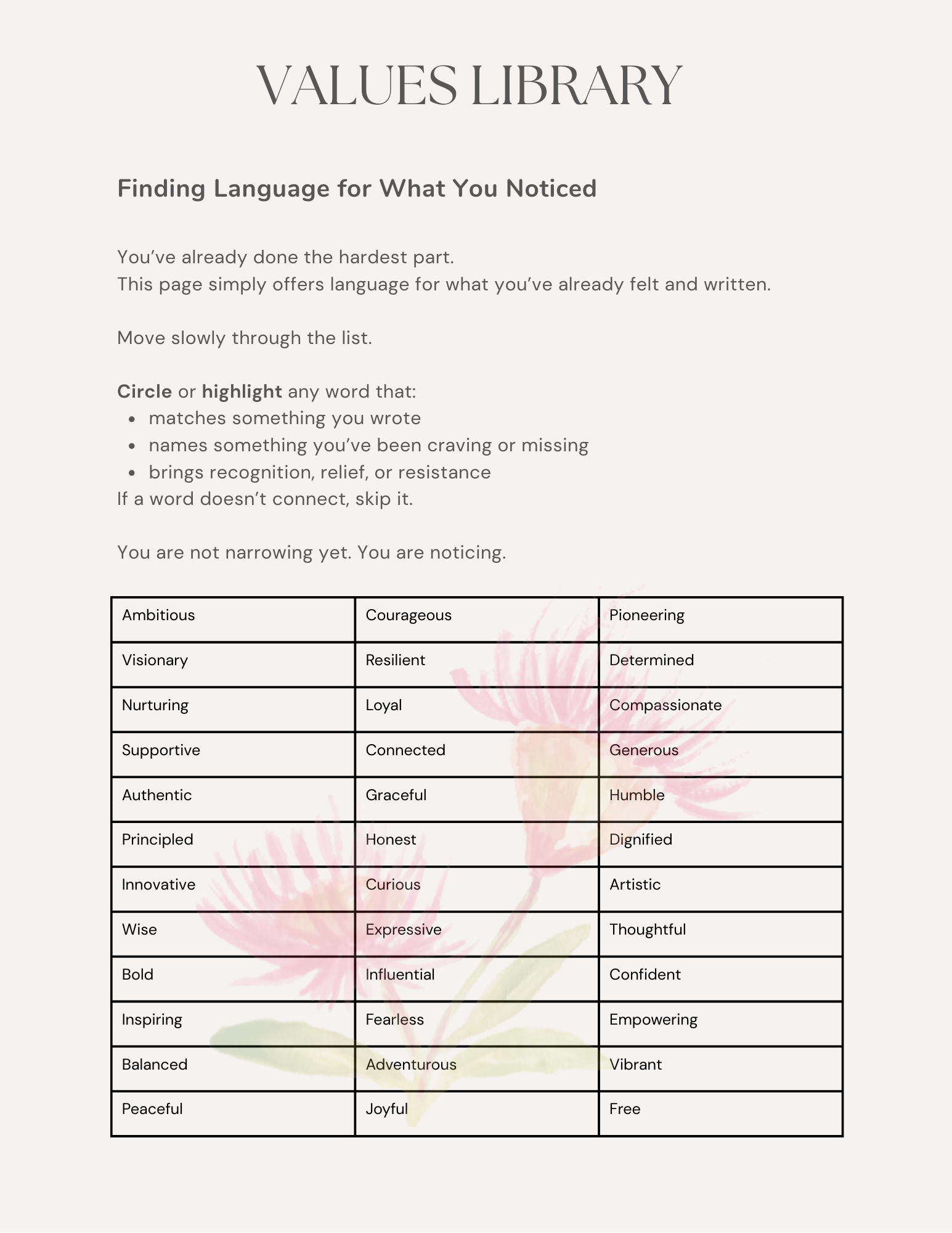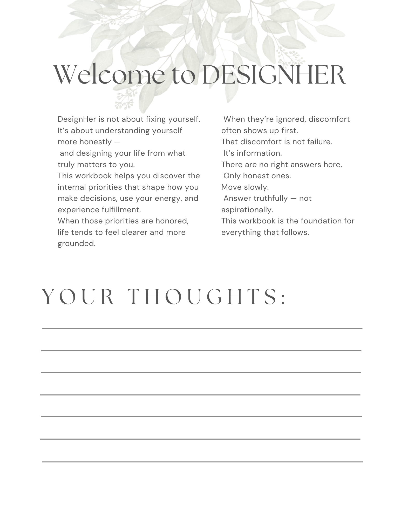 The DesignHer™ Values Discovery Workbook helps you clarify what truly matters — not what you should value, but what actually shapes your energy, decisions, and sense of fulfillment.